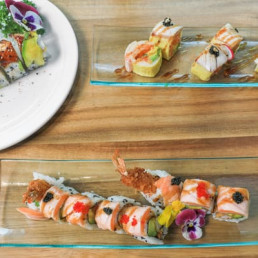 Feuille de soya, thon sashimi, saumon sashimi, tartare cabre des neiges, avocat, tempura, tobiko