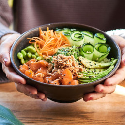 Riz frit,saumon,poivre,avocat,mayo,huile de truffe,Jalapeno